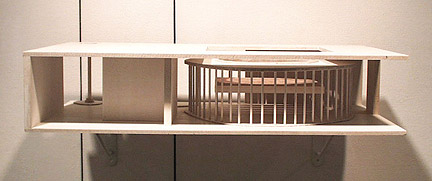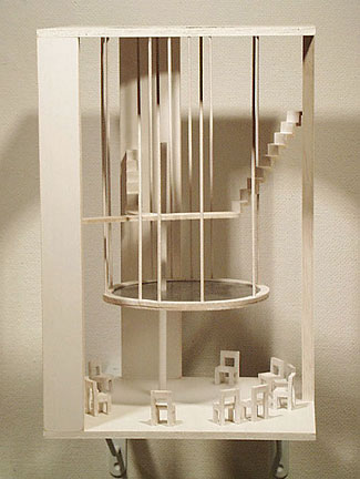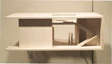 コイズミアヤが作る「ボックス」は、いずれも木の素材に白のペイントを施したシンプルな箱である。これらはまた、閉じられている箱を「開く」ことによって、その内部におさまっている空間があらわれるしくみになっており、ここでの箱は舞台装置のような役割をもっているようにも感じられる。蓋を開くタイプのものから、数段階に分かれて開く仕掛けがあるものまでそのしくみはさまざまだが、箱を開くとそこには、同じ材質で作られた木の林、あるいは行き先のわからない階段、まるで別 の次元につながりそうな扉などがあらわれる。