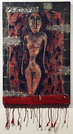 立つ人 A 古布・エンコスティック・鉛をコラージュ 22×40cm