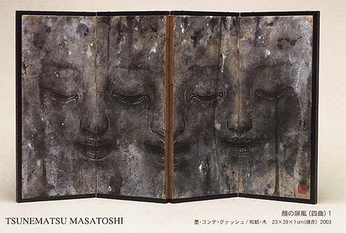 昨年より試行錯誤を重ねてきた“顔”を主なモチーフとした、大小さまざまなサイズの自作新作屏風を中心に20数点を出品予定。併せて、1998年の映画『白痴』に続き、再び取り組んだ映画の仕事 −北村龍平監督の『スカイハイ』に使用された「死界の書」と、その挿画6点及び下絵を特別出品します。