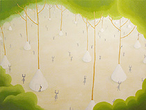今回、新たに表現しようとした世界は、「他者を見る事と自分を見る事の関係性」です。今まで、自分の立ち位置や、他者との距離感みたいな物を追ってきましたが、自分自身、他人をどのように位置づけているのかを考えました。この時、まず思ったのが、まったく見識のない他人と、友人や知人、親類など、存在の意識レベルの差異が確実に存在している事でした。今まで、自分対他者という形式で表現してきましたが、今回は自分対知っている人対知らない人という図式になったと思います。なぜこのような事を意識したかと言えば、一年の海外生活が影響しているという事が大きな起点だったように思います。まったく知らない人だらけの土地に行って、生活し、一から人間関係を作りあげていく事、それは楽しくもあり、苦痛とも言えました。ましてや、言語、文化、国籍の違う人達を自分自身の価値観を頼りに信頼すべきか否かを判断しなくてはいけなかったのです。こういった環境の流れの中で、私自身、他人をそのように見ているのか、その視点に気づかされました。結局、自分(の価値観)に似ているか、似ていないか、そして、それ故その相手に好意を抱くか、嫌悪を感じるかという感情が生じていたように思います。ここでは、決して似ているから好きという訳でもなく、似ていないから嫌いという価値観で図っているものではありませんでした。似ているからこそ嫌悪を抱いたり、似ていない人に尊敬心を抱いたりもしました。結局の所、他者が自分自身の世界の中に引き込まれているというのを感じたのです。一般的に客観的に見るという言葉がありますが、完全な客観性など誰も持ち得ないという事を感じたのです。今回の海外研修の研修目的は移民の人々のアイデンティティ意識を追うというのが自分の中で大きな要素でした。しかし、そもそもアイデンティティとは、自己存在証明という物で、個人の人格は度外視した一定の価値基準によって、その個人がこの世に生まれた時点から植えつけられる物であると思ったのです。それを抱え生きてきた過程の中でそれぞれの価値観という物が養われていくと思うのですが、決してそれは誰とも1ミリの狂いなく一致できる物ではなく、千差万別の物であるのです。それぞれの意識がもし有形的に見えるとしたら、その集団が社会を作りだし、共存しているというのはとても騒々しい、激しい物であると感じたのです。そこで、自分自身を振り返り、友人、知人に対する目線を意識してみると、自身と他者を峻別できずに、混同したり、依存している姿が見受けられたのです。結局、どれだけ他者への配慮を持ち得ようとも、自身の世界の中に引き込んだ価値観の中で人間関係を作り上げている事は否定できなかったのです。それぞれが独立した世界の密集を社会という大枠でくくると、いかに、個人(各、自分自身)という物が孤独であるかを感じたのです。今回ギャラリー椿さんで描こうとしている世界は、その個人の内面世界で、そこに引き込まれた他者が登場します。それらは自身に同化され、同じ容姿をしています。また、今までの表現形式も用い、まったくの他人はうさぎとして登場します。その二つの他者の線引きというのは、それぞれの人の価値観によって生まれると思いますが、そこも、今回表現したかった重要な部分だと言えます。佐藤美術館では、知人も他者もまったく排除した、自分自身のみに視点を向ける世界を描こうと考えています。人間が生み出した、風景としての社会と自分との関わり、それは他者が存在しない事によって、誇張された一体の人物の不安や、孤独さを引き出すことによって、いかに、人は他者からの目線を期待しているかを表現できたらと思っています。 呉 亜沙 |