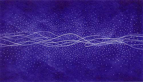 紺青の韻律―空と海は、太陽の光を受けて、スカイブルーや紺碧の青を演出する。空を見上げたとき、スカイブルーは私に穏やかな安心を与えてくれる。そのときに感受する青は、温かな青であり、また、自然に眠りを誘われる柔らかな青でもある。海の水が太陽の光を受け表出される紺碧の青は、すべてを吞み込み,無の世界へと連れ去ろうという企てを感じる。 青に対する想いは,人それぞれに異なった感情を持っている。青という色を作り出す方法にも多様な技法があり、さまざまである。私の青は、1インチに85の点を刻む彫刻刀・ベルソーによって、無数の小さな穴を、銅板に刻み込むメゾチント技法によって生まれる。この小さな点の周りには,粘りのある銅が起き上がり、あたかもサンドペーパーのような形状となっている。そんな、ざらざらな地肌を削ったり磨いたりすることにより,青の階調が現れる。そう,メゾチントの技法は,無限の時間をのみ込みながら,創作する私に素敵な青―紺青の韻律を送ってくれる。 「星」について 「line」について 「Fusion」について 「青、ゆらぐ」について |