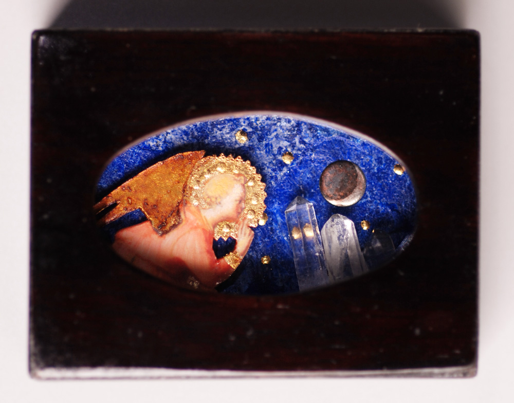 27.桑原弘明 銀の月 黒檀に漆、ラピスラズリ原石、水晶、金箔、 真鍮に銀メッキ、コラージュにアクリル絵の具、ガラス 2011 |