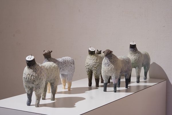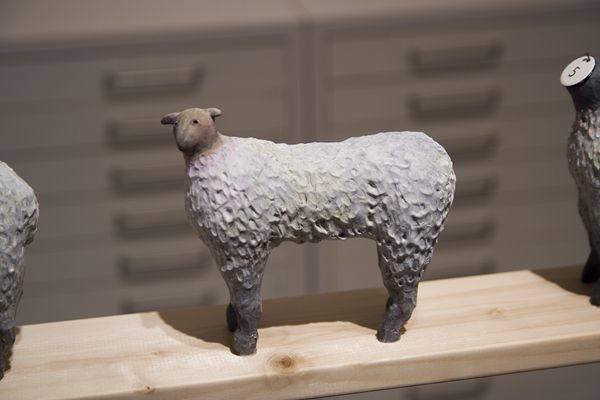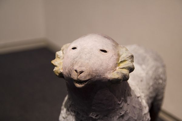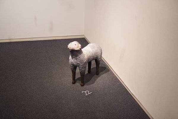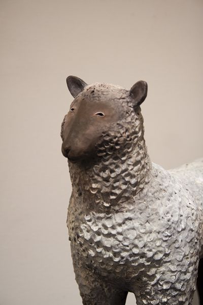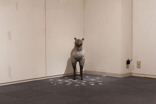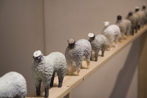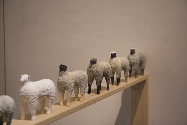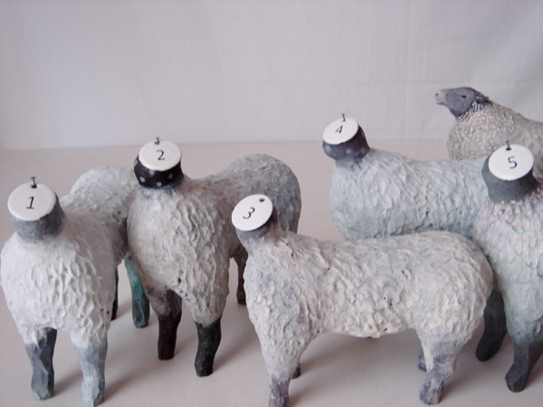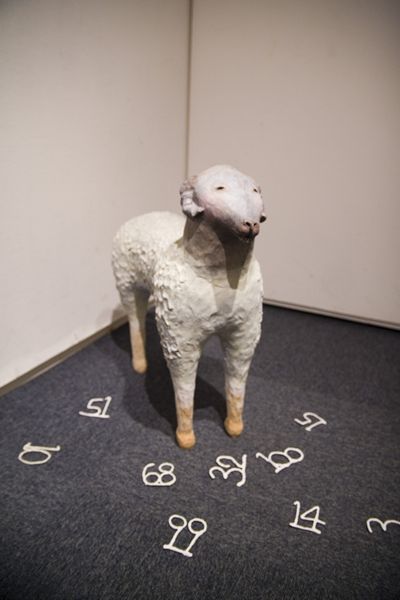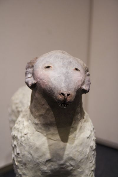 「快適なる1/3の人生の為の羊」 15x14x6cm, 石粉粘土、木、和紙, 2012