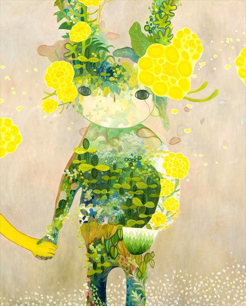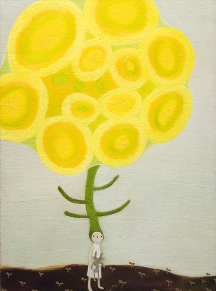 その大槌の祖母の墓は高台にあるので、幸い津波の被害はありませんでした。そしてそこからは小さな大槌町全体が見下ろせるのですが、本当に大半がなくなってしまっていました。しかし、震災から2年、色々な物が流された跡に植物が命を実らせていました。菜の花もそのひとつ。人はそれを雑草と呼びますが、雑草という植物はなく、それぞれ名前を持っています。でもアイデンティティをテーマにする事が多かった私は雑草という言葉に注目した時に人間も“雑草“と同じだなぁと感じました。むしろ雑草より雑種だし、複雑な存在であるから、今あるアイデンティティは迷路のようだと思います。それをそのまま子供に向けた視線で描いたのが今回描いている”雑草さん ”達です。