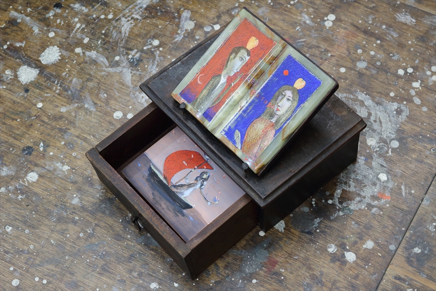 2 書見台にある 古いインドの小箱18.7×25.7×10.5p、イタリアの本形の大理石15.5×17.5×2p、銅板11×15p 古いインドの小箱、イタリアの本形の大理石、メゾ銅板、古釘/テンペラ、油彩 2019