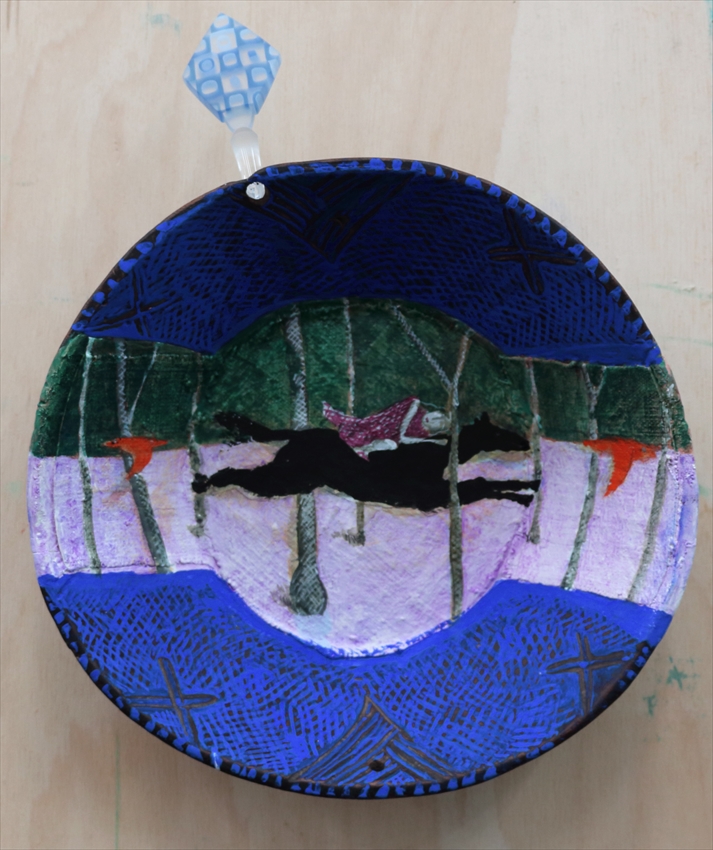 20 おおあらせいとうの森を駆け抜けた 32×26.5×8 インドネシアの木鉢、ガラス/テンペラ、油彩 2019