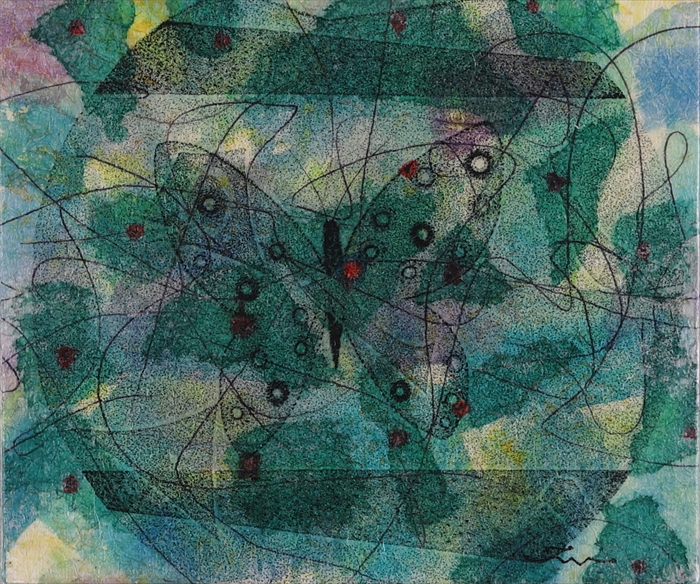 19 蝶 11.7x13.7 cm 銅版画をコラージュ、彩色、キャンバスボード 価格: 88,000 円(額・税込)