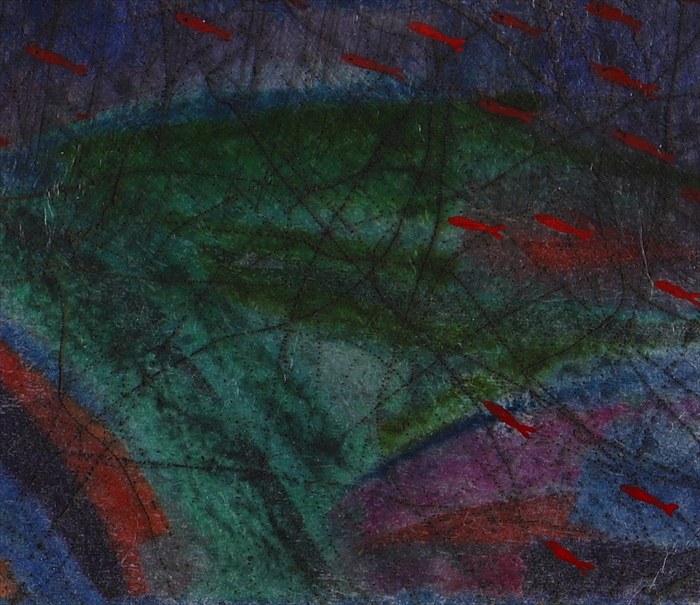 21 赤い魚 11.7x13.7 cm 銅版画をコラージュ、彩色、キャンバスボード 価格: 88,000 円(額・税込)