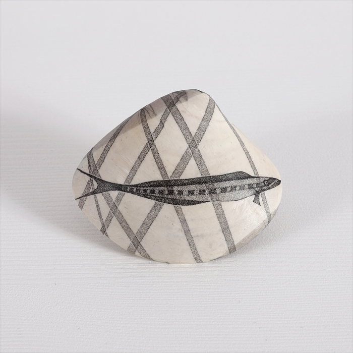 33 音と魚T 7.5x9x2 cm 貝殻に銅版画をコラージュ 価格: 55,000 円(額・税込)