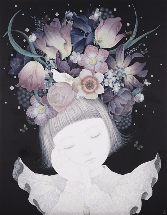 1 Closed Eyes 和紙に墨、岩絵の具、アクリル、シルクスクリーン F50 116.7×91.0 cm 2022