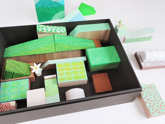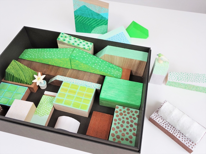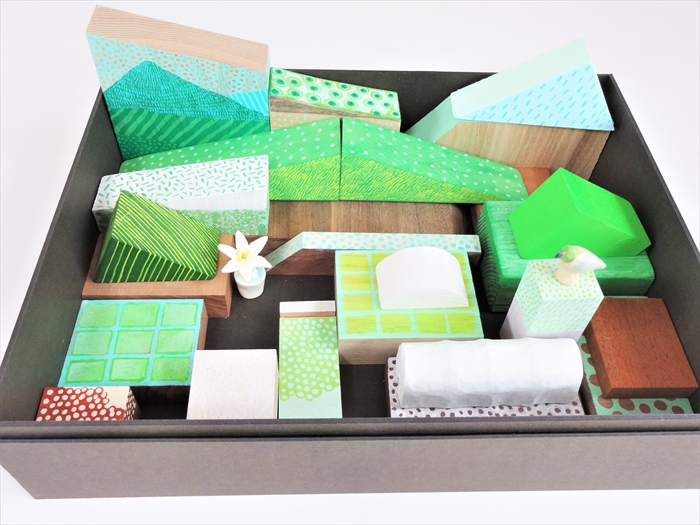 8 田舎の風景ブロック(木材のはじっこ、世界のはしっこ) 木材(木っ端)陶石粉粘土アクリルガッシュ 25x 33x8.5cmの箱