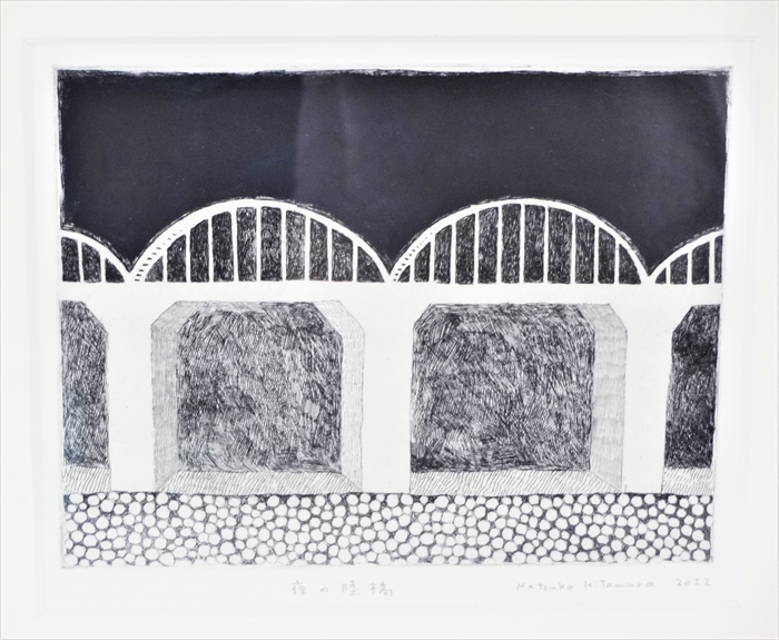 23 夜の陸橋 銅版画(エッチング)アクリルガッシュ鉛筆額 29x38 cm(額サイズ)