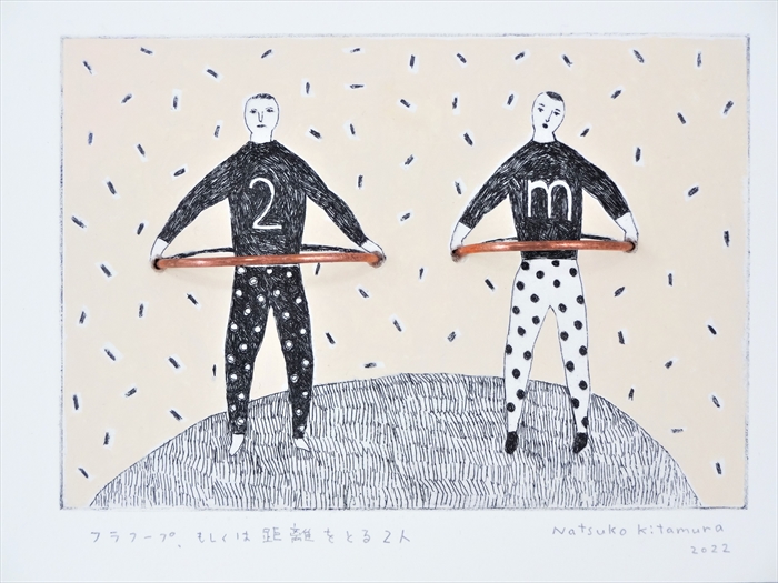 40 フラフープ、もしくは距離をとる2人 パネル銅版画(エッチング)アクリルガッシュ銅線 14x18 cm