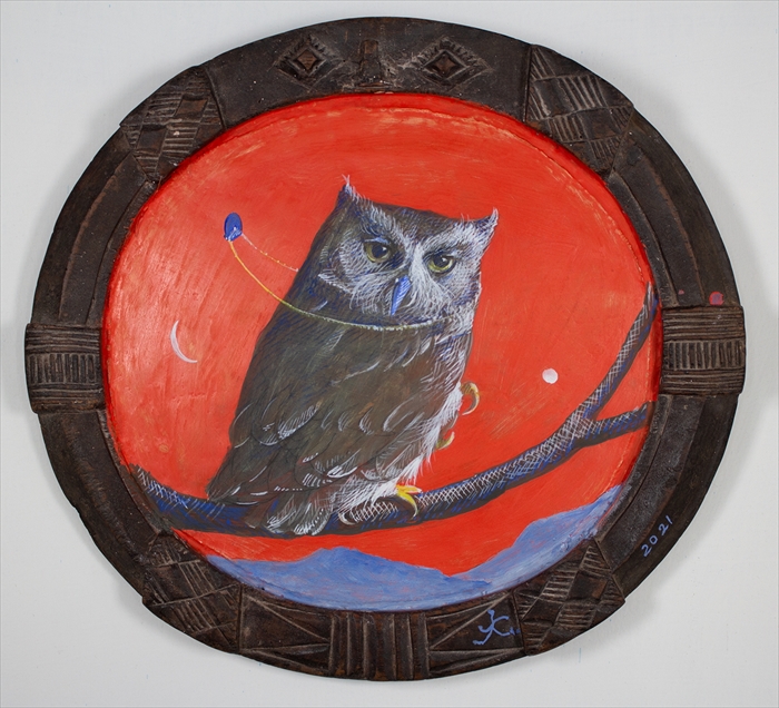8 メッセンジャー -歩く梟 ヨルバ族の占いボードに綿布をマウント/テンペラ、油彩 29x31p 2021