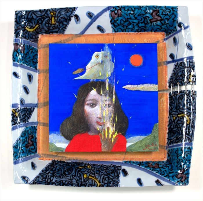 14 光・・メッセンジャーといる 白象磁器額.パネルに綿布をマウント/テンペラ、油彩 白象磁器額41.5x42x8p 2022