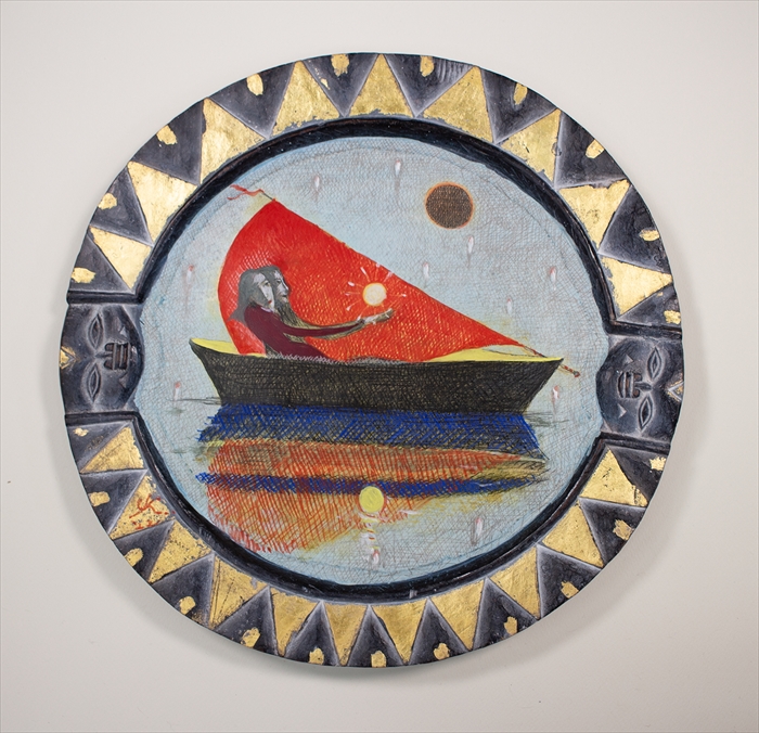 18 小さな帆掛け船 ヨルバ族の占いボードに綿布をマウント/テンペラ、油彩 38.5x38.5x3p 2022