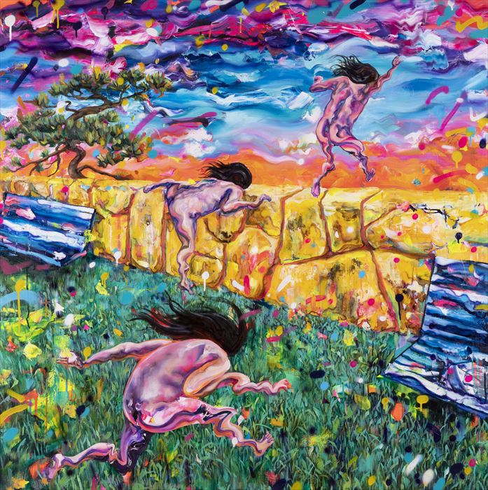3 夕焼けチャイムが鳴り終わる 油彩、アクリル、キャンバス S50 116.7x116.7cm cm 2024