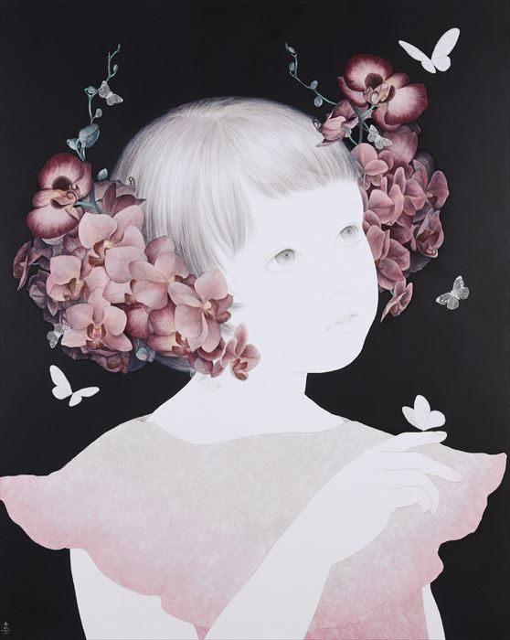 3 Orchid Children(pink) パネル、和紙に墨、岩絵具、アクリル、シルクスクリーン F40 100x80.3 cm 2023