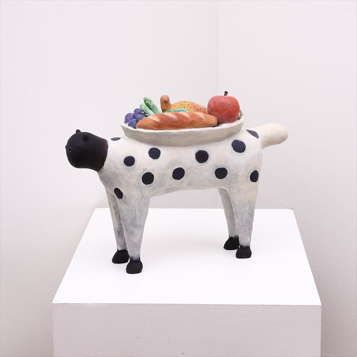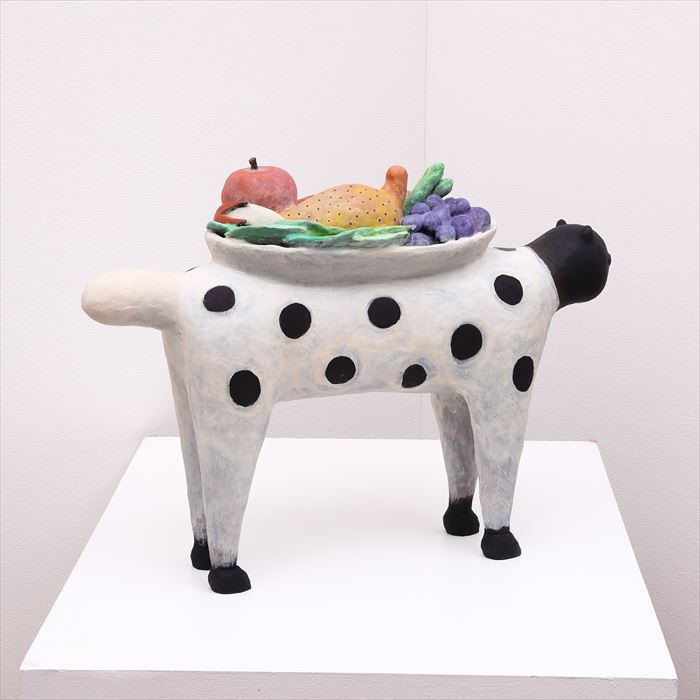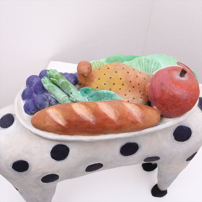 1 Bringingごちそう 石粉粘土、木材アクリルガッシュ、和紙 39x15.5x54 cm 2023〜2024