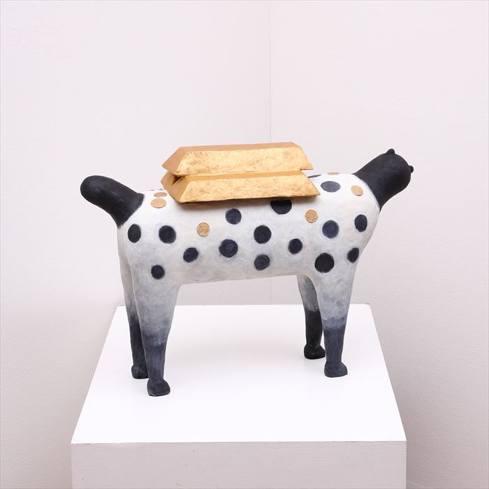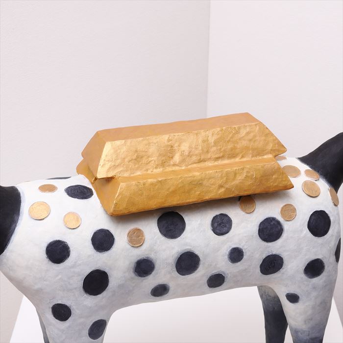 4 Bringingお金 石粉粘土、木材アクリルガッシュ、和紙 43x16x61 cm 2023〜2024