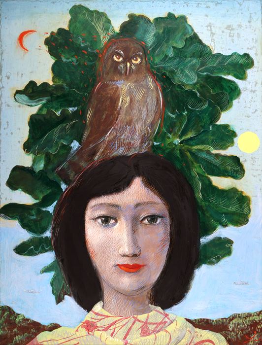9 アオバズクの頃 アルキド樹脂によるテンペラ、油彩、パネル 6F 41x31.8 cm 2024
