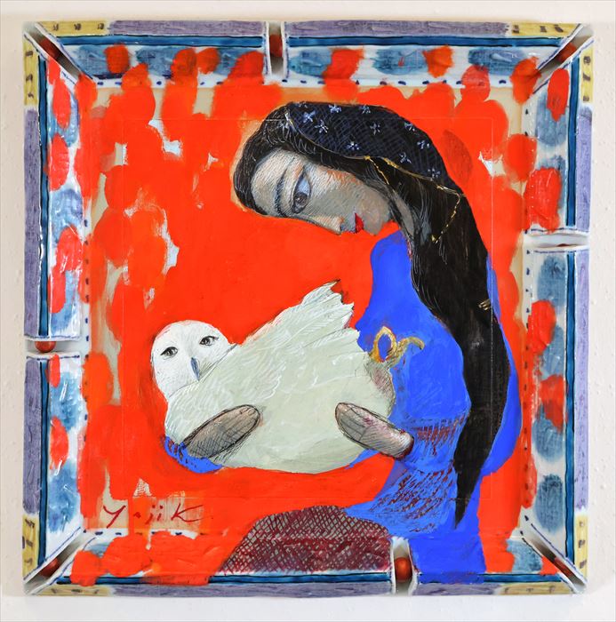 15 果樹園にて アルキド樹脂によるテンペラ、油彩、磁器工房白象九谷焼 45.5x45.5 cm 2024