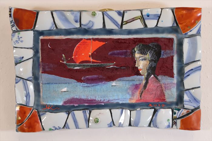 16 鎮める夜に アルキド樹脂によるテンペラ、油彩、白磁器工房白象九谷焼 21x31x3 cm 2024