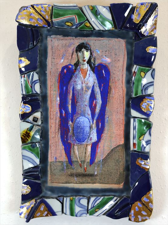 17 青い大きな卵 アルキド樹脂によるテンペラ、油彩、磁器工房白象九谷焼 32x19.5x4 cm 2024