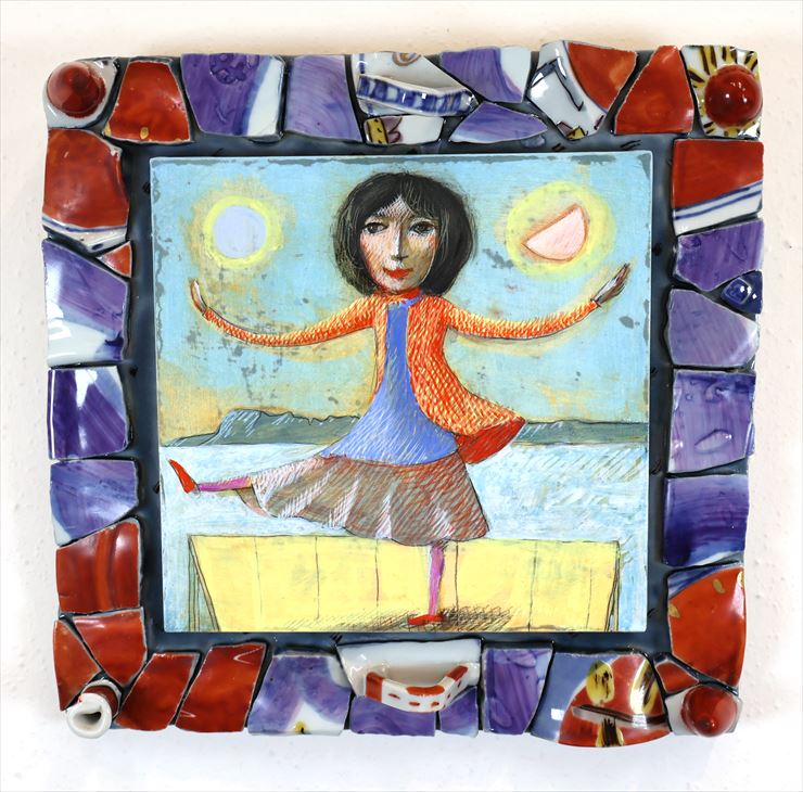 19 雲海に舞う アルキド樹脂によるテンペラ、油彩、パネル、磁器工房白象九谷焼 24.5x25.5x3 cm 2024