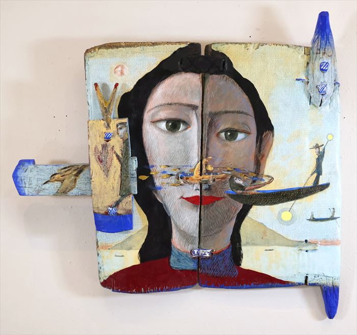 20 通過する記憶 アルキド樹脂によるテンペラ、 油彩、ドゴン族食物庫の扉 53x55x5 cm 2024
