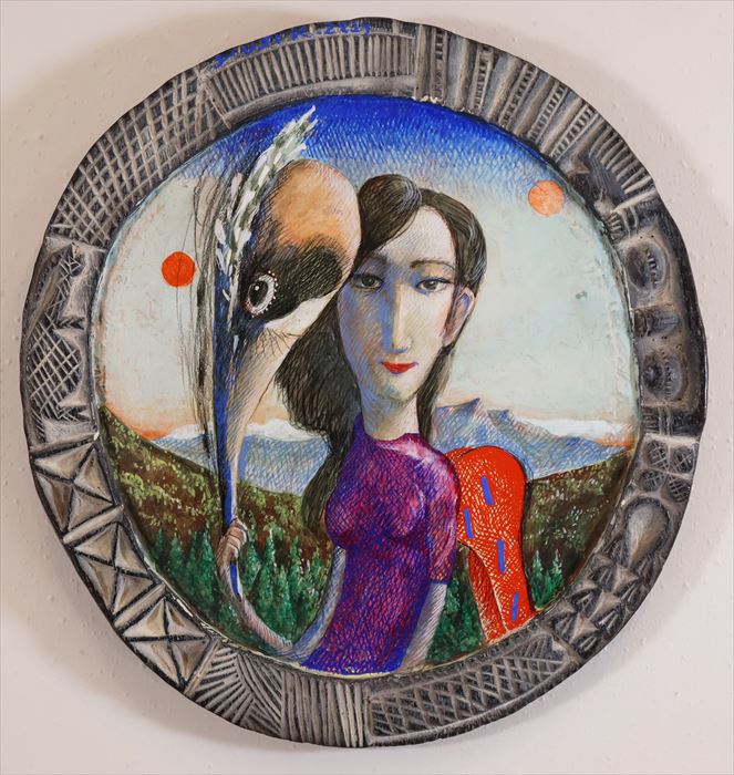 22 カケスの仮面 アルキド樹脂によるテンペラ、油彩、ヨルバ族の占いボード Φ36x3 cm 2023