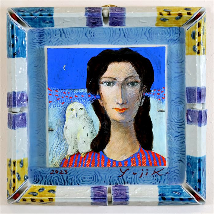 29 梟といる アルキド樹脂によるテンペラ、油彩、パネル、磁器工房白象九谷焼 45.5x45.5 cm 2023