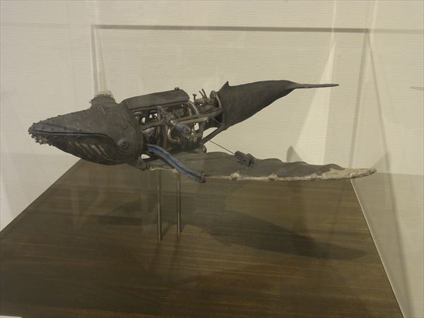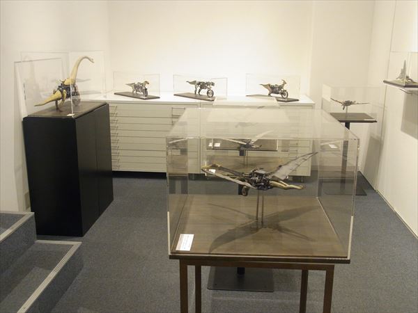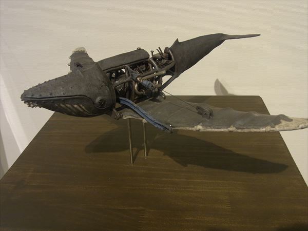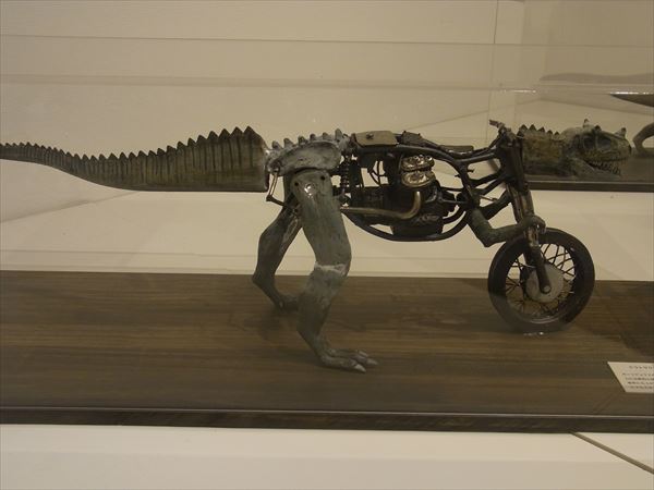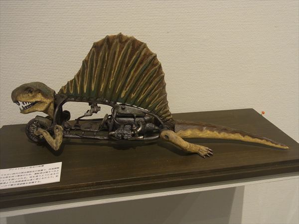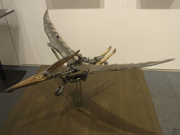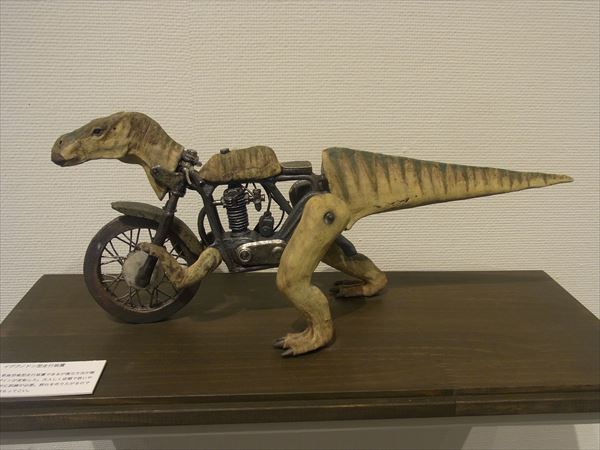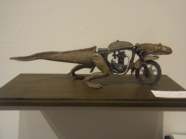 次に塩澤展を紹介させていただく。 2012年に初めて塩澤の作品を、すぐ目の前にあるギャラリーなつかで見て、思わず2点の作品を衝動買いをしてしまった。 それがきっかけで、アトリエを訪ね、今回の私どもの初めての個展に繋がったのである。 オートバイと恐竜、動物達、どれも私の童心、遊び心をかき立ててくれるものであった。 それと同時に、オートバイの精密なエンジン部分や車輪のスポークまで微細にわたり全て陶で作っていることに驚かされた。 私どもにも人に真似の出来ない超絶技法の桑原弘明や篠田教夫がいるが、彼もまたその卓越した技量で見る人を魅了させる作家の一人である。 一瞬、ジュラシックパークに紛れ込んだかと錯覚するようなわくわくする世界を見せてくれている。