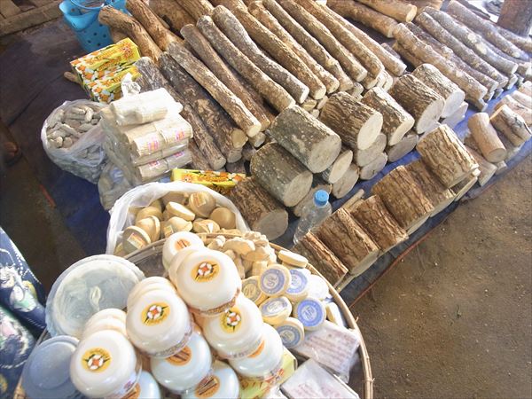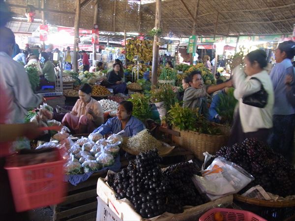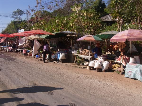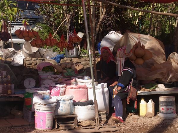 この地域は焼き畑農業が盛んで、山肌はほとんど禿げ山となっていて、最盛期には、その煙で飛行機が飛ばないこともあるそうだ。 バザールには台湾人が入植しているせいか、お茶を売っている店が多い。 お店を構えているのは、中国や台湾人で、アカ族などの山岳民族は道端でタロイモ瓢箪などを売っていて、かなりの格差社会。