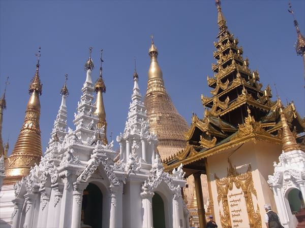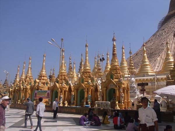 ミャンマーは初めて訪れる国で、軍事政権から民生移管が実現して民主化が進んだこともあって、一度行って見たいと思っていたところである。 ミャンマーはイワラジ川を中心に肥沃な大地を抱え、多彩な民族が住んでいて、勢力争いを繰り広げていたが、その中でビルマ族が台頭して、11世紀にバガン王朝が栄え、仏教が急速に広まり、現在のミャンマーの基礎が築かれた。 16世紀から18世紀にかけて新たな王朝がミャンマーを大きく発展させた。 18世紀に入り、イギリスが進出してきたことで情勢が一変し、イギリス領インドに併合され、さらにその後進行した日本軍により独立を果たすが、終戦とともにイギリス領に戻り、その後の独立によって社会主義国家となり、その後の軍事政権を経て現在に至っている。 現在のミャンマーには11世紀からの仏教遺跡が多数残っていて、今は欧米や日本から多数の観光客が訪れるようになった。 最初にミャンマー仏教の総本山シェダゴンパゴダを訪れた。 ここには高さ約100メーターの黄金色のパゴダがそびえる。 2500年前にブッダの前髪8本を収めたのが始まりと言われ、周囲にも壮大な寺院が建ち並び、全体が金箔で覆われ、上部には無数のダイヤモンドやルビーなどの宝石が散りばめられ、それは豪奢な眼を見張るようなパゴダである。 私もアンコールワットなどの仏教遺跡を見てきたが、これほどスケールが大きな遺跡は初めてで、ただただ唖然とするばかりであった。