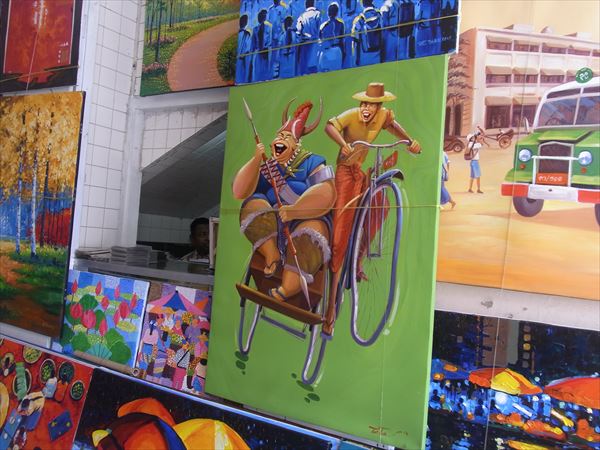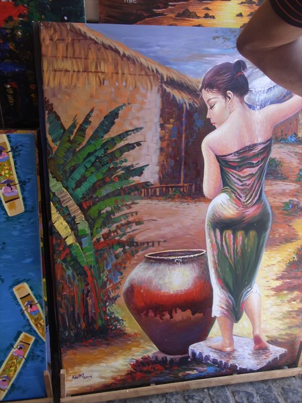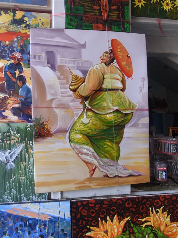 1月29日続き パゴダを見た後、アウンサンマーケットに行く。 アウンサンスーチン女史のお父さんは、ビルマ独立運動の英雄として崇められ、道路やマーケットにその名が付けられている。 マーケットは殆どがヒスイ製のアクセサリーを売っていて、私には大して興味がないが、ミャンマーはヒスイの産地として知られ、最近は中国が大量に買い付けに来ていて、価格が高騰しているそうだ。 マーケットの入り口には大量の絵が飾られている。 お土産みたいな絵ばかりだが、値段を聞いてみると20号ぐらいの大きさで3、4万円くらいだそうだ。