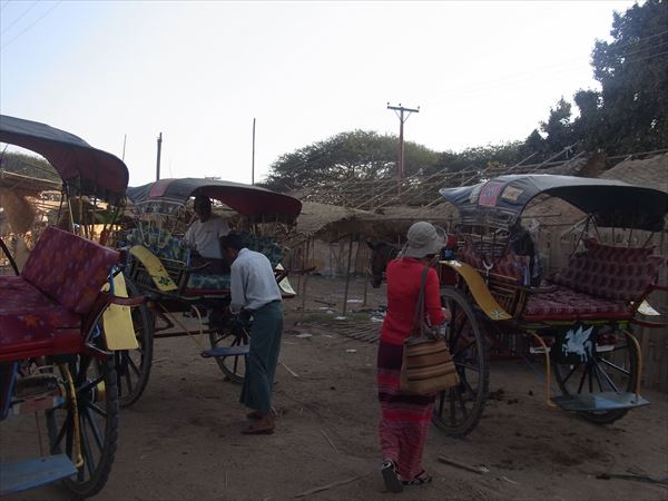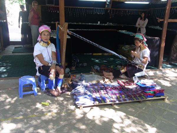 夕方には馬車に乗って、パガン遺跡や昔ながらの生活をしている村落を見た。 そこには、首長族が機織をしていて、らせん状の金環を長いのは20週以上巻いているそうで、寝る時も外さない。 辛そうで見てられないが、それが当たり前のような顔をして、ひたすら機を織っている。