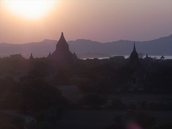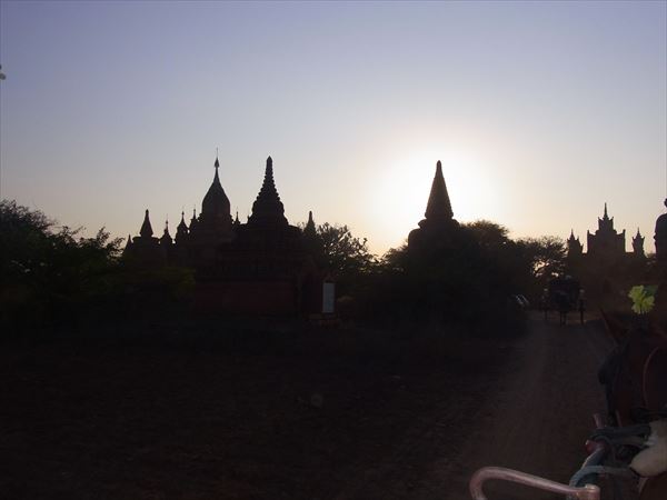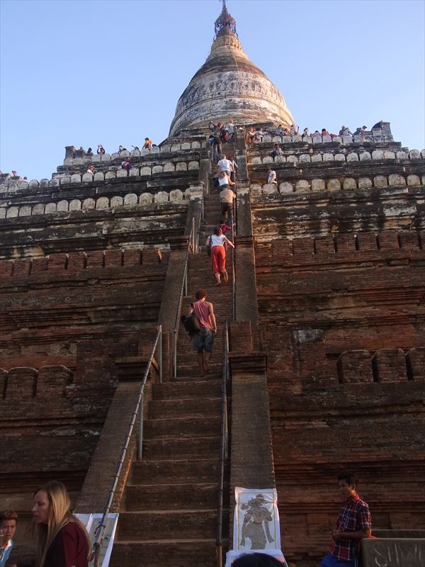 最後は高く聳えるパゴダに登り、仏教遺跡に沈むサンセットを見に行く。 大地に沈む荘厳な夕日にしばし心奪われる。 ただし、登りも急な階段だったが、帰りは直角に見える急な階段を高所恐怖症の私は身が竦む思いで恐る恐る降りていく羽目に。 1,2日ではとても廻りきれないほどの仏教遺跡だが、その威容にはただただ驚くばかりで、観光地化せずに、いつまでも当時のままの姿で残っていってほしいものである。