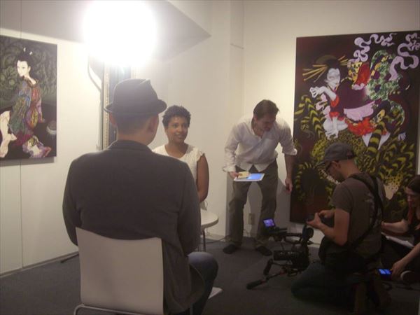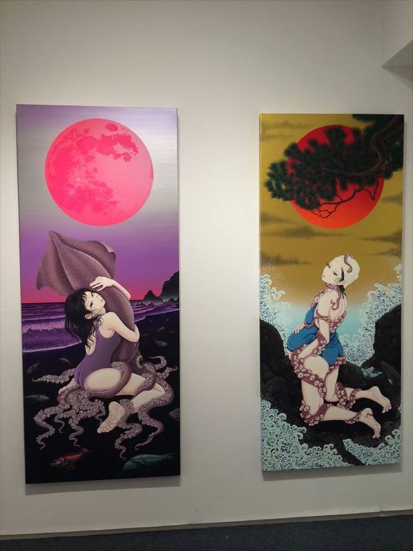 ●4月1日 早いものでもう4月。 桜も満開、春爛漫の一年で一番いい季節である。 今宵は屋形船で隅田川の花見と洒落込むことになっている。 大学のヨット部の先輩達の古希のお祝いを兼ねた花見会で、シドニーの孫達も丁度いい機会なので連れて行くことにしている。 昨日はカナダからテレビクルーが画廊にやってきて、てんやわんや。 カナダの"eureka!"TVが森口裕二のインタビュー取材のために日本にやってきた。 「エロス」をテーマに世界のアーティスト達を取材し、ドキュメンタリーシリーズとして放映されるそうである。 急遽GTUに森口作品を並べて、テレビカメラが廻る中をフランス語によるインタビューとなった。 フランス人の通訳が付いてくれていて事なきを得たが、こうして大掛かりに日本まで訪ねて来ての制作で、どのような番組になるのか楽しみである。 森口は来年に大作による個展をうちで予定している。 写真の月と太陽の対の大作は上海の個人美術館に収蔵が決まっているが、この作品も上海に行く前に展示ができるといいのだが。 もう一点は高畠華宵のオマージュ展に出品されたもので、現在近くのスパンアートでその展覧会が開かれている。