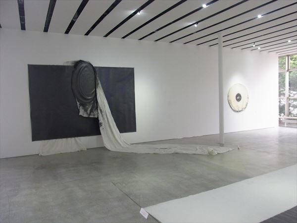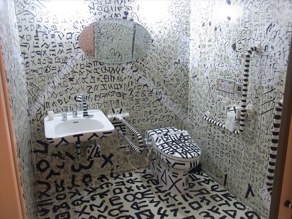 ニューアートミュージアムの2階では、具体美術の作家達の大作が展示されていて、こちらも圧巻の展示である。 私が大阪の勤務時代からよく知っていて、今は椿近代画廊でも個展を開いている具体の中では一番の若手の松谷武判の作品が特に見ごたえがあった。 トイレには向井修二のライブペインティングが施されていて、使用するのに躊躇してしまうが、どうやら用を足した人もいるようだ。 ミュージアムの裏には隈研吾氏設計のウエディング会場が建設中で、そこにはフランスの代表的立体作家オトニールのオブジェが設置されることになっていて、2階会場にもオトニールの作品が展示されていた。