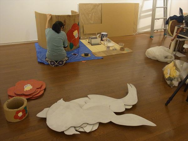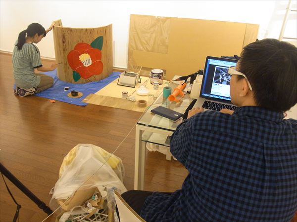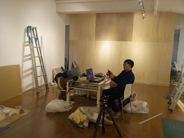 ●4月28日 王君と友人の竹内さんは昨日から河口湖の撮影用の小道具作りと画廊の壁にベニヤを張って、個展のときの背景作りに余念がない。 彼は約一ヶ月日本に滞在し、個展の準備と新たに日本での撮影の計画をしている。 彼の作品は、背景を自分自身で描いたり、モデルにはボディペインティングを施したりで、撮影前のセッティングが大変だ。 それでも、この準備を見ているだけで作品へのワクワク感が増してくる。 ヌードのモデルさんもみんな友達であったり、知人の紹介であったりと素人ばかりで、それもノーギャラの全くのボランティアである。 それが彼の準備や設営を見ていると、すっかり乗せられて、恥ずかしがらずにモデルになってくれるのがよく分かる。 とにかく開放的で明るく楽しい。 5月号のアートコレクターズの特集「これは、芸術家?ワイセツか?」にも王君が紹介されているが、彼のヌードはどう見てもワイセツではなく、健康そのものである。 明日の河口湖の撮影では果たしてどのような写真になるのか、今からワクワクしている。
