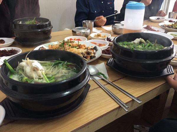 連休中の日記 5月2日 朝早くから海雲台のビーチを歩いて、ビーチの端にある小さな漁港へ。 ここに幾つものお店があり、とれたての魚を供してくれる。 その中でもフグ屋さんはいつも朝から行列ができるほどの人気店である。 朝にあがったというトラフグをぶつ切りにして、野菜とともに煮込んだ鍋が出てくる。 鍋の周りには朝から食べきれないほどのおかずが出てきて、見ているだけでお腹がいっぱいになる。 ホクホクのフグと薄味のスープが絶妙で、釜山に来たらこれこれを食べなくては来た甲斐がない。 今朝は最上級のフグを頼んだが、それでも一人3000円、日本では少なくとも3万円は取られるだろう。 肉に魚と美味しい食事をし、麻友香展も初日から上々のスタートとなり、老体に鞭打ちハードな日程でやってきた苦労が報われるようだ。 一度戻って、次は台南の岩淵展が待っている。