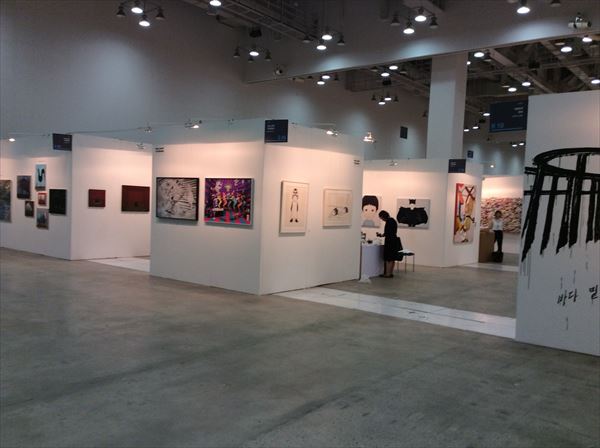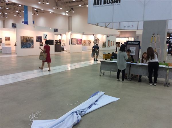 ●6月3日 昨日までの東京の蒸し暑さと違い、釜山は海からの風が爽やかで、肌に心地よい。 空港からフェアー会場に直行。 会場はびっくりするくらいに広い。 1階だけでも東京のフェアーの倍以上もあって、同じ広さで3階にも多くのギャラリースペースが並ぶ。 うちのブースは1階入り口のすぐ横にあり、毎回参加している事への主催者の配慮だろうか。 昨年は3階会場がハンディーがあるということで、1階のメーンゲートを閉鎖し、3階から入場するようにし、VIPルームも3階だけにしたが、今度は1階にお客様が降りてこなくなり、1階のギャラリーからクレームが殺到して、結局途中から両方の入り口から入れるようになった。 とにかく会場が広く、今年は200以上の内外の画廊が参加している事もあり、1階、3階を行き来するのはかなりの覚悟がいる。 主催者側も今年はVIPルームを両方に設置し、3階ブースは同じブースフィーでも1階よりは広くするなどの配慮をしているが、あちら立てればこちらが立たずで、主催者も苦慮するところである。 お付き合いのある釜山のふたつのギャラリーは、ハンディーがあるにもかかわらず、敢えて3階ブースを申し込んだようで、何らかの考えがあってのことだろうか。 果して、結果は如何に。