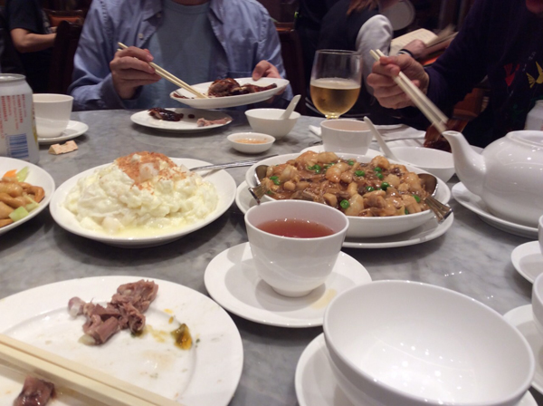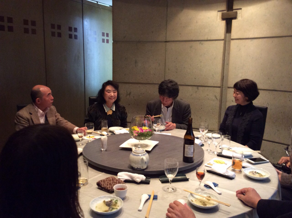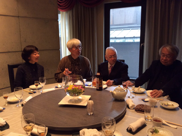 森口作品は台湾や上海、香港に多くのファンがいることもあり、それを期待しての企画だが、大きい上に価格もかなりの高額なので、結果がどうなるか不安と期待半々である。 本人も来てくれていて、会期最後まで手伝ってくれることになっている。 6時前には展示も終了し、夕食に会場近くの美味しそうなレストランを探しながら歩いて行くが、巨大なビルばかりでなかなか見つからない。 相当歩いて地下鉄の中環駅近くでようやく美味しそうな北京ダックのレストランを見つけた。 機内食を朝に食べたきりで、空腹と展示と歩きで相当疲れていたので食事にありつければどこでもいいと思っていたが、ここの料理はどれも大満足。 特に北京ダックは最高で、皮だけでなく丸ごと食べるのだが、ハチミツの味付けと香ばしい香りで、森口やスタッフの島田も大喜び。 お店も次々にお客が入ってきて大盛況。 観光客らしき人はほとんど見かけないので、地元で人気の有名店なのだろう。 どのくらいが香港の料理店の値段の基準かわからないが、これだけのお店なのでそこそこの値段はしているのでは。 今日は朝から強い雨が降っていて、オープニングが3時から始まるのだが、それまでに止んでくれるといいのだが。 その時間には、是非一度は見ておいたほうがいいとお誘いした東京美術倶楽部の会長で全美連の理事長でもある浅木さんが見えることになっている。 今日のアートセントラルと明日の香港バーゼルを見学してもらうことになっている。 この二つの団体は、そのほとんどのメンバーが古美術と日本画など近代美術主体のメンバーばかりなので、この機会に浅木さんに世界の有力画商が集まる香港のフェアーを見てもらい、今後の日本での美術業界の新たな展開になればと思っている。 今回のフェアーでも、アートセントラルに以前は近代美術中心だった横井春風洞、彩鳳堂、小林画廊、白石画廊など、香港バーゼルには日動画廊が参加してて、業界の流れは現代アートに向かいつつある。 ●3月20日 昨日は「弓の会」の昼食会。 日本テレビで以前「美の世界」という番組があり、その司会をアナウンサーの井田由美さんがされていた。 そこに出演した作家さん有志がどうしても井田さんとお近づきになりたいということで発足した会で、どういうわけか出演したこともなく、作家でもない私も誘われるままにメンバーの一員となっている。 そんな経緯で年に2,3回集まっては食事をしたりしていて、河口湖の家でもみんな集まってバーベキューをしたこともある。 また作家さん達で「弓の会」と題したグループ展も時々開催している。 今回はメンバーの多くが節目の年ということで、お祝いの会を兼ねてやることになった。 二人が80の傘寿、一人が喜寿、私ともう一人が古希ということでお祝いをしてくれることになった。 井田さんは私の大学、それも学部も学科も同じ可愛い後輩でもあり、日本テレビのアナウンス部長を務めるベテランアナウンサーでもある。 現在は「皇室日記」という高貴な番組のメーンキャスターを担当していて、局の品位を一人背負って活躍をされている。 メンバーの作家さん達の展覧会には必ず顔を出す義理堅い人でもあり、こうした井田さんの人柄もあって、「弓の会は」井田さんが元気でいる限りずっと続いていくのは間違いない。 問題はメンバーがいつまで元気でいられるかである。