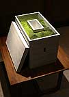 これまでは白く塗られた何気ない箱の中に都市であったり機械であったりと人工的な構築物を造ってきたが、最近は自然との関わりにその表現が変わってきていて、今回はあたかも箱庭のごとく広大な緑の山々が小さな箱の中に納められている。
