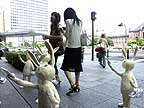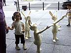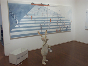 作品は可愛らしいうさぎ達が登場するのですが、ただ可愛らしい作品というのではなく、何気ない風景の中や何気なく行き過ぎる人達といった無意識の中での自分の関わりをうさぎに置き換えたり、自分と対峙させる事で現代社会が抱える問題を模索しようとしています。
