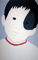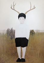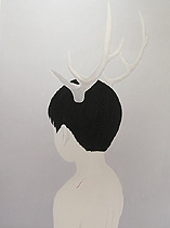 「white antler」という作品があるんですが、私は実際に見たものでなければ描けないので、角を粘土で作って着色して写真に撮りまして、少年の頭につけるように描いたんです。写真が基ですから段々と映像的になってしまって、自分がイメージしたものと違ったので一旦それを消して、なるたけ平面的に見えるようにして、その上に全然違う空間をもってこようと思いました。それは一見すると分からないかもしれませんが、そこに違う空間があると見る方は違和感を抱くであろうと、それは100%心地の良いものではないから、何気なく通り過ぎようとすると、「ん?ちょっと待って、何か変だな」と、もう一度振り返って見てくれる。そういう作品にしたいなと思っています。