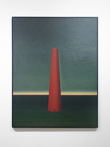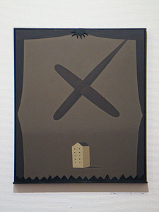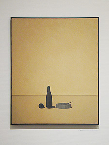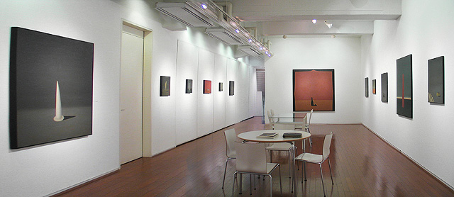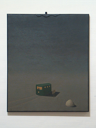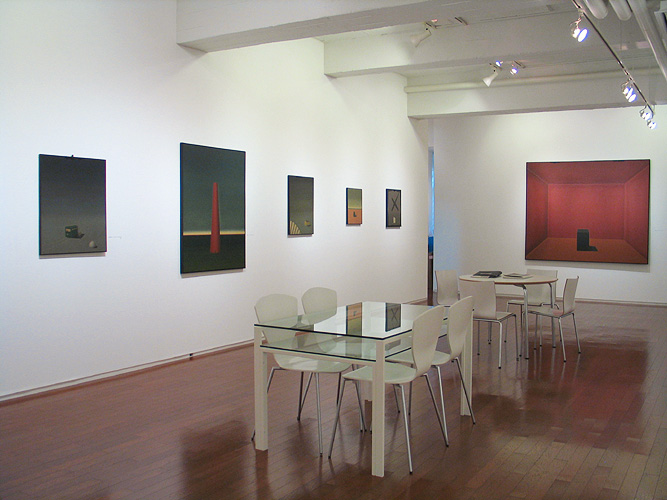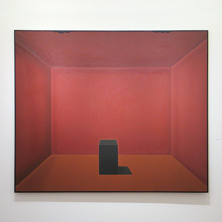 ・・・私は思うのですが、先生が表現されている世界は、形而上学的で人の意識を垂直に降りていった深層界のゼロポイント。逆に言えば表層的な部分での感覚では見えないのではないかと。そういう世界観を描いてらっしゃる様に思うのですけれど・・・。自分とってのリアリティーといいますか。ポエジーといいますか。先ほどお話した自然の内に在るものを顕現しないことによって、自身でより強く感じられることなので、意識してやってはいないんです。例えば正面に展示されている作品には箱が描いてありますが、素材が鉄なのか木なのか段ボールなのか。質感を見ても限定できない。むしろご覧になられた方が決めて下さればいい、逆に分からないという感じをもって下さってもいい。ただ大事なのは謎めいた危険性のようなものを感じて頂けるかどうかだと思います。危険性の美しさといいますか。この絵は僕そのものですから、不安や孤独感・・・孤独感といってもセンチメンタルな孤独感ではなく、人間本来の個としての認識。それを肯定している面はあると思います。