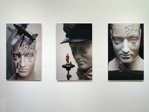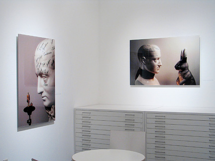 ・・・被写体と言われましたが、作品を拝見していると、「物」の持っている歴史をとても感じます。例えば白い人物像は、標本みたいな物なのでしょうか。日本で全身に漢方のツボが記された木製の胴人形は見たことがあるんですけれど。顔に書いてある文字はフランス語ですか。いえ。英語です。脳機能局在論というのがありまして、脳(特に大脳皮質)の(部分ごとに)機能を司っている場所が書いてあります。これはイギリスのものですが、パリの骨董店で見つけました。骨相学の見本です。陶器で出来ているんですよ。医学の模型として使っていたレディーメイドなんです。