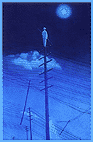 〈月影奇談〉 日々忙しく暮らしていて、あまり月など見上げることもないかもしれませんが、 満月の夜などは、街灯の他に月の光りもさしているのです。 道に街灯のそれとは、ちがった影ができているのに気がついたことはありませんか。 月影とは、月の光りでうつるものの影だけのことではなく、月光や月の姿などもさすのだそうです。 月影の中夜道を行けば月がずっと自分について来る、と大人になっても感じられる方はけっこう多いと思います。 月夜には、普段と少しちがった感覚が味わえるものなのです。 今回は、お月様や月と親しくしている人物に登場願って、そんな月影のさす夜にふとよぎった幻想を主に描いてみました。 1999.9.13 小浦 昇 |